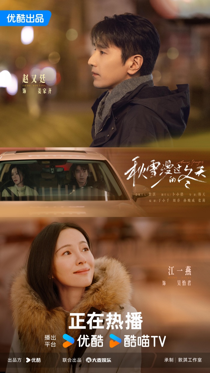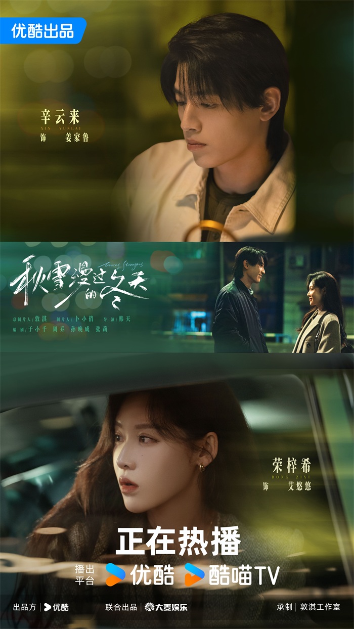 优酷全网独播都市情感剧《秋雪漫过的冬天》今日正式收官。该剧由优酷出品,大麦娱乐联合出品,敦淇工作室承制。金牌制片人敦淇担任总制片人,卜小俏担任制片人,导演韩天执导,于小千、周乔、孙晚成、张莉联合编剧,赵又廷、张子枫领衔主演,江一燕、张超、荣梓希、杨一威、迟嘉主演,迟蓬、徐洁儿、姚琛特邀出演,辛云来特别主演,张新成特别出演。