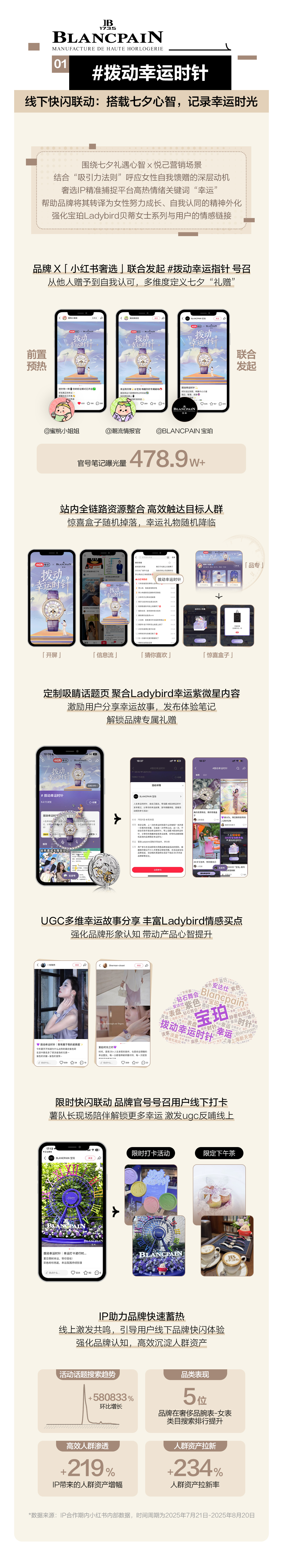 BLANCPAIN宝珀#拨动幸运时针:搭载七夕心智,品牌携手奢选IP发起#拨动幸运时针 的号召。线上通过全链路资源整合高效触达目标人群,线下联动限时快闪活动激发UGC反哺线上。最终实现高效人群渗透增长219%、人群资产拉新增长234%。