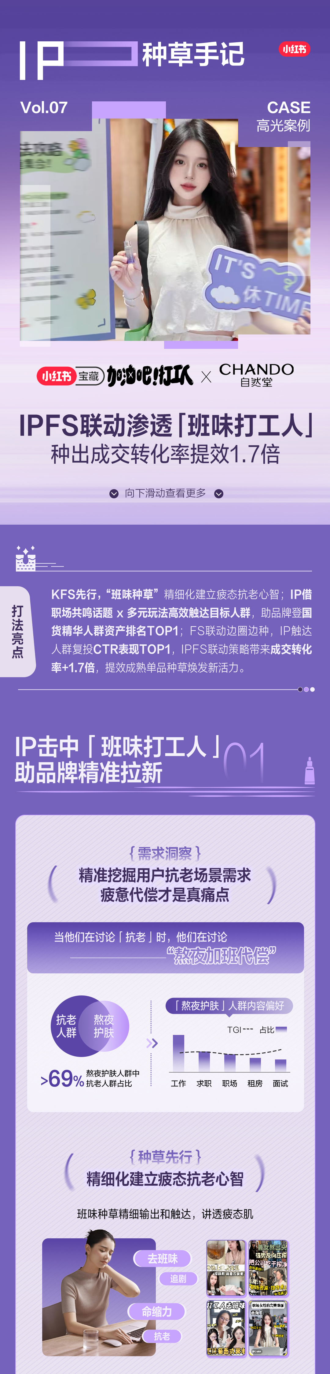 随着营销进入“精耕细作”时代,单次的IP曝光已难以支撑品牌对长效增长与量化结果的诉求。实践案例证明,品牌合作⼩红书营销IP的同时,如果与FS产品种草策略相互协同,有助于进⼀步对话消费者,放⼤品牌在⼩红书的营销种草成效,为品牌撬动更⼤的营销收益,收获更丰富的经营资产。