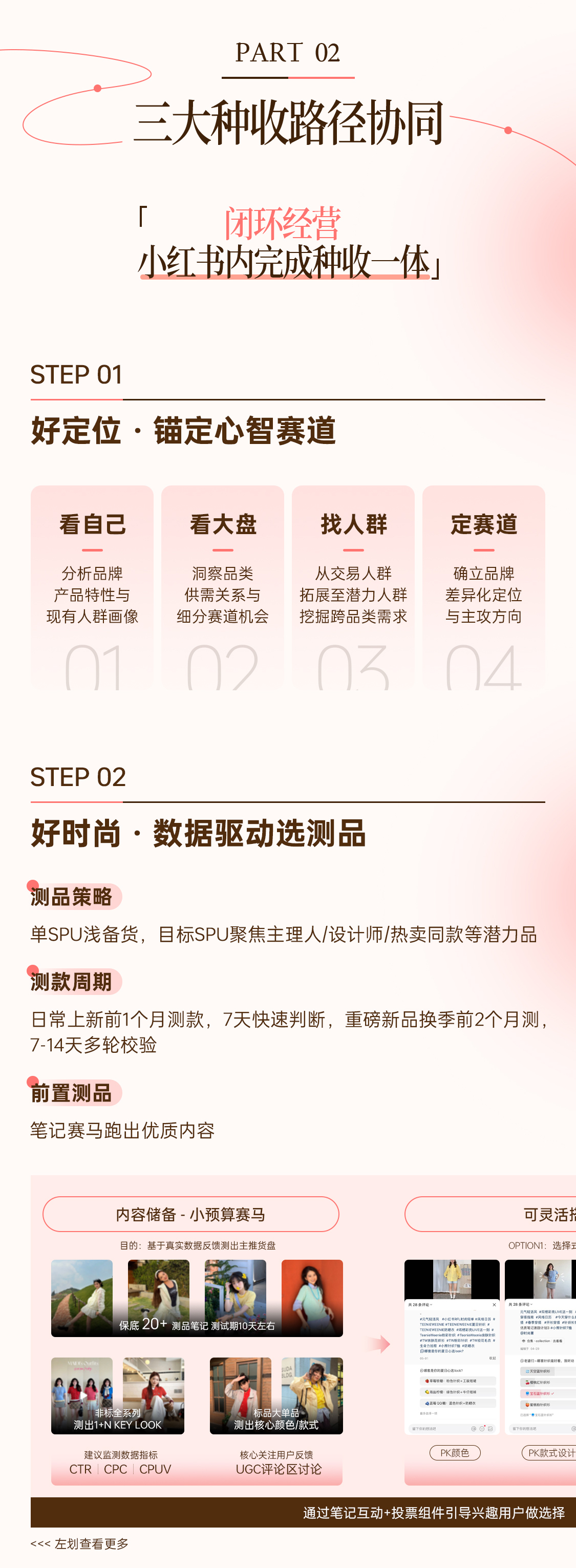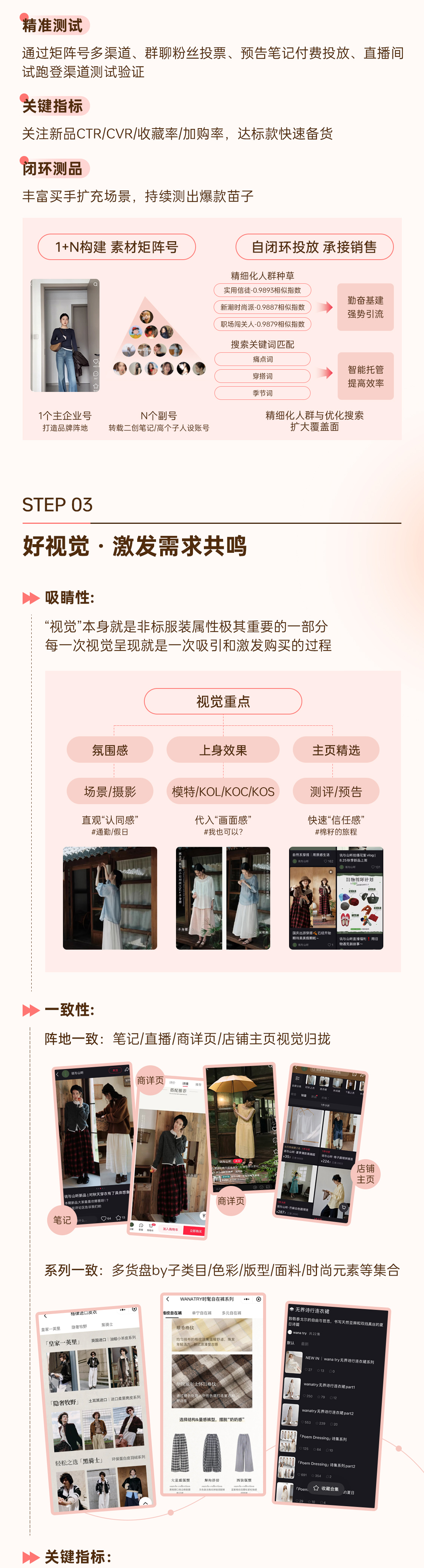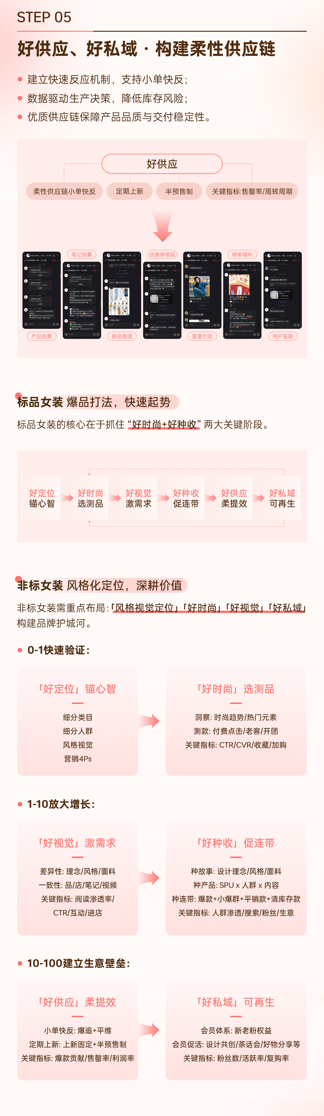 然而,女装商家仍面临“人货场”三重挑战。对此,小红书提出 「女装经营六部曲」——好定位、好时尚、好视觉、好种收、好供应、好私域,系统化解经营难题,实现可持续增长。