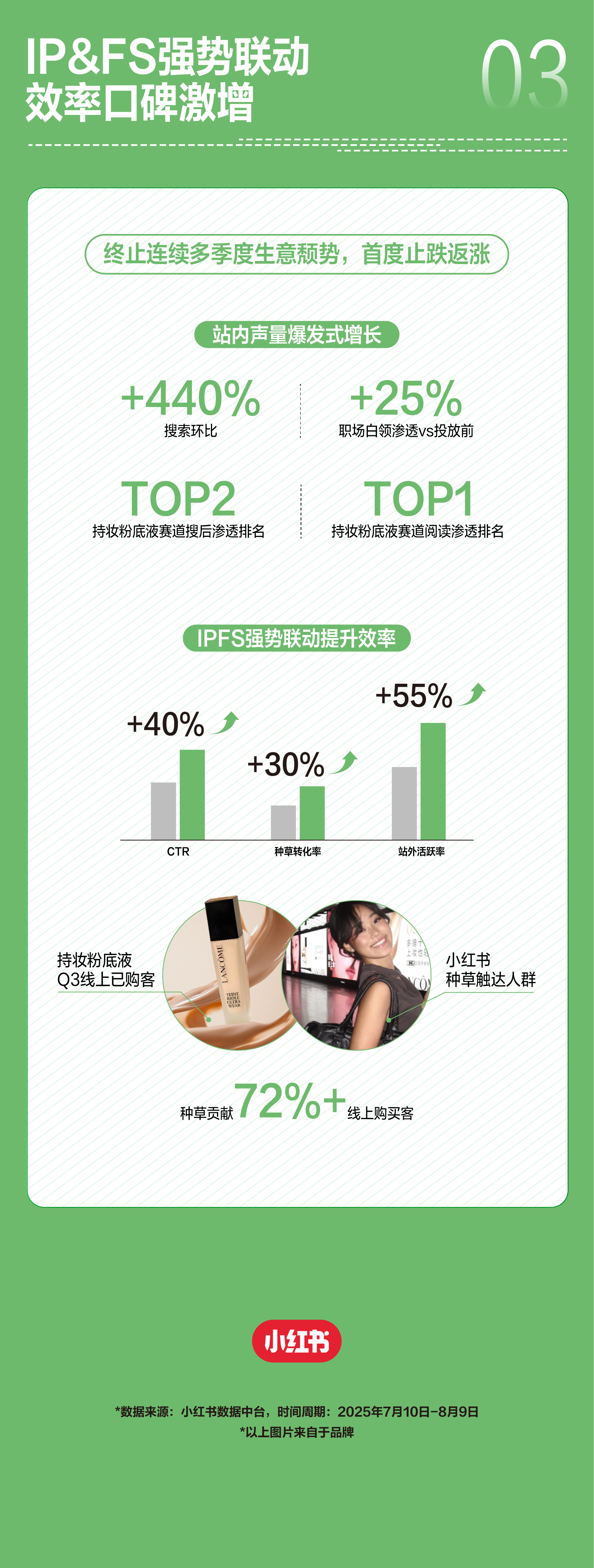 小红书生长于「真诚回应每一份真实精神需求」的土壤,始终强调“人Matters”。在此生态中,平台自然孕育原生内容场,让趋势融入无痕;在UGC洪流中筑起脉冲中心场,精准渗透人群心智;并与品牌深度协同,将IP势能转化为长效资产,持续反哺长尾渗透。
