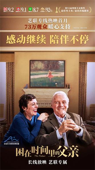 作为2021年内地唯一献映奥斯卡获奖影片,《困在时间里的父亲》上映首月获76万人暖心支持,在放映场次不占优势的情况下,创造了连续4日新片上座率霸榜第一的佳绩,票房一路逆势攀升,亮眼表现获业内一致看好。目前影片票房已接近2900万,创造了2021年艺联专线上映影片最好的票房成绩,也让《困在时间里的父亲》成为艺联专线继《波西米亚狂想曲》、《三块广告牌》之后最卖座的品质佳片。影片由艺联专属长线放映,暑期档继续陪伴。