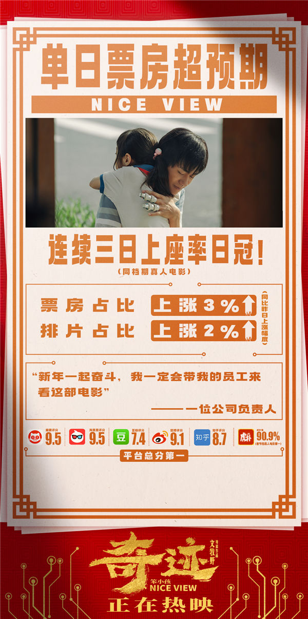而影片上映第九天,连续三日蝉联同档期真人电影上座率日冠,票房占比上涨3%,排片占比上涨2%,全平台口碑总分稳居首位,累计票房超8.5亿,并首次发布正片片段“雨中赞歌”,展现片中“奇迹小队”不屈从生活,风雨并肩共逐幸福,以歌寄情,传递出人与人之间的包容与温暖。影片正在全国热映中。