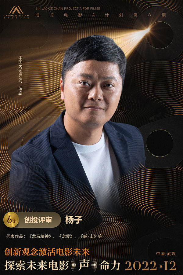 “成龙电影A计划”第六期将于2022年12月在武汉落地举行。本期“成龙A计划”以创新观念激活电影未来,探索未来电影“声”命力为主题。特邀华夏电影发行副总经理黄群飞、导演陈国辉、导演杨子、导演张律、电影评论人谭飞组成创投会评审团进行评选工作,为青年电影人项目支持计划保驾护航。此次主办方公布创投评审团的同时,也公布了由黄明升、刘江江、孙琳、张大鹏四位导演组成的拍摄工作坊导师团。