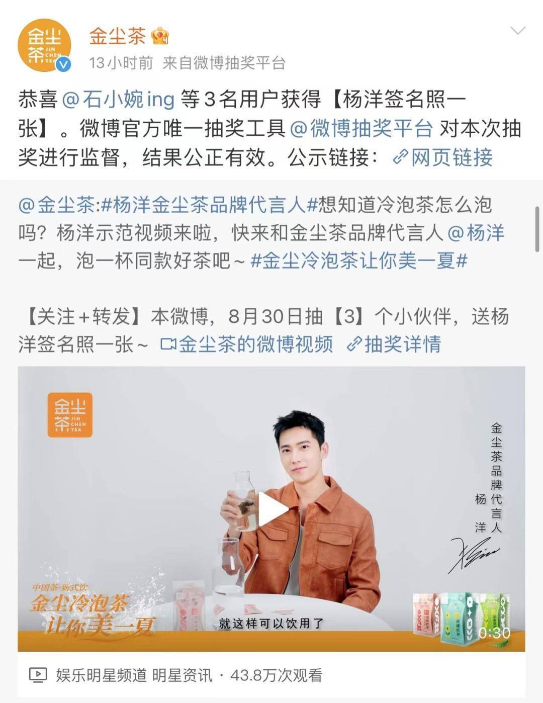 与此同时,金尘茶官方微博的官宣博文转发量已破百万,点赞和评论也已超过30w。截至目前,金尘茶官宣杨洋为代言人的相关话题曝光数据仍呈现上升态势。