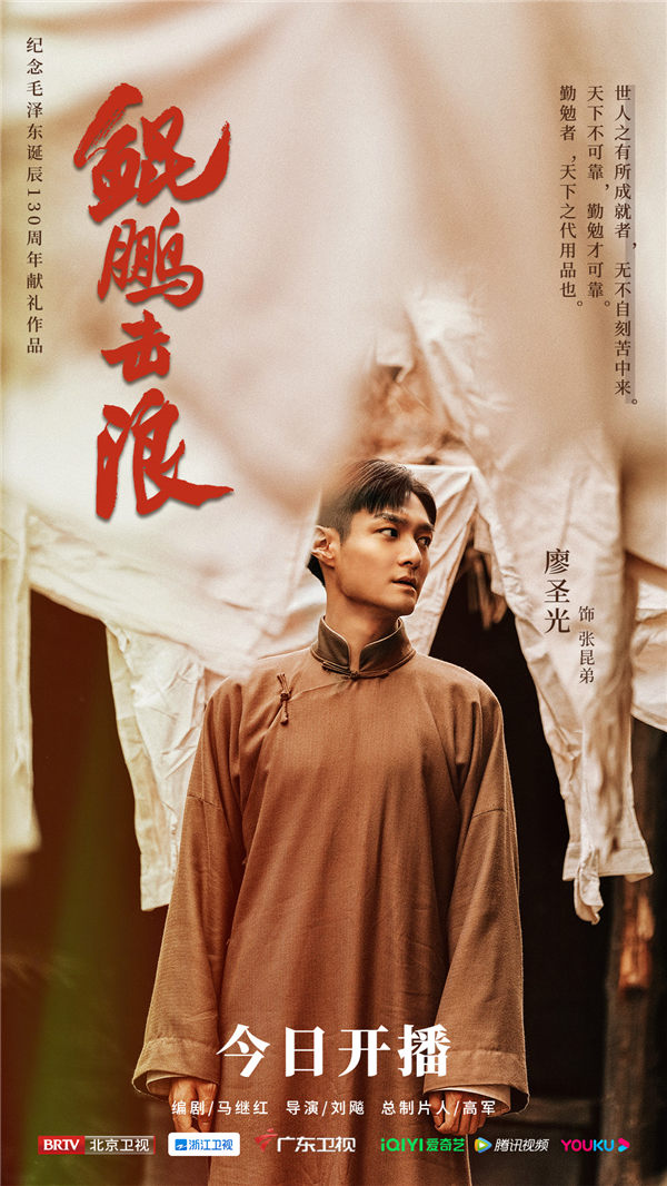 由马继红担任总编剧,导演刘飚执导的纪念毛泽东同志诞辰130周年献礼作品《鲲鹏击浪》将于今日在北京卫视、浙江卫视、广东卫视、爱奇艺、优酷、腾讯视频6大平台燃情开播!其中,青年演员廖圣光饰演革命英雄张昆弟,作为毛泽东、蔡和森的挚友,三人曾一起创建新民学会,被共同誉为“岳麓三杰”。据悉这是廖圣光首次出演重大革命题材电视剧,其表现令人期待。