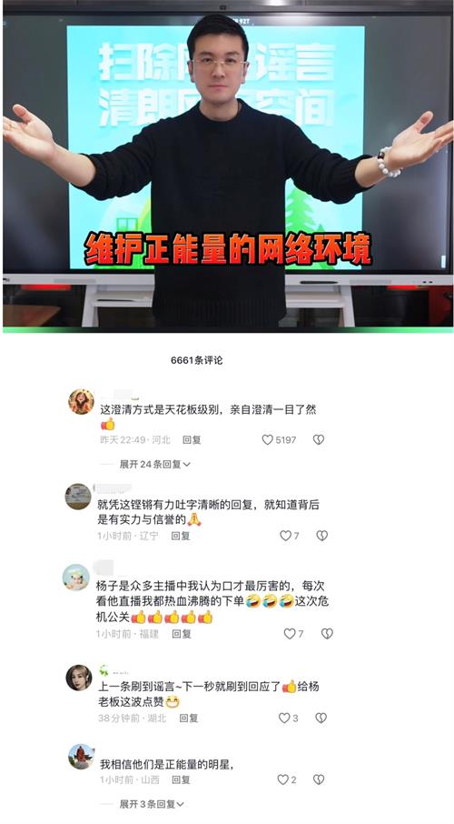 杨子发出该澄清视频后,“杨子回应带货风波”相关话立即冲上各大平台热搜榜,网友得知事实真相后,纷纷留言:“这澄清方式是天花板级别,亲自澄清一目了然”、“就凭这铿锵有力吐字清晰的回复,就知道背后是有实力与信誉的”、“上一条刷到谣言,下一秒就刷到回应了,给杨老板这波点赞”、“我相信他们是正能量的明星”、“杨子是众多主播中我认为口才最厉害的,每次看他直播我都热血沸腾的下单,为这次危机公关点赞”!