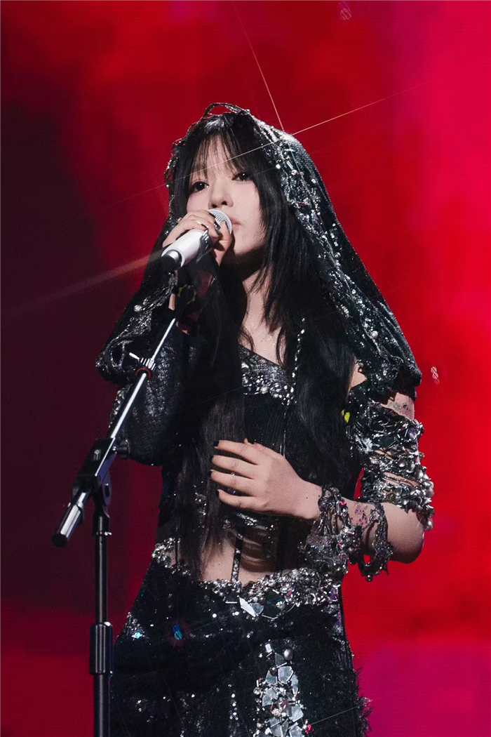 当晚演唱会的开场即连连引爆惊喜。房东的猫身着暗黑定制礼服登场,舞台聚光灯下,佩岭肩部的长纱随步伐轻盈摇曳,而心怡身上的亮片星河则跟随她的姿态流转闪耀。据悉,这套名为“浪漫海盗”的服装是独家定制,巧妙融合了海盗的自由精神与清新浪漫的艺术内核,是对房东的猫音乐灵魂的深刻视觉诠释。在歌迷的阵阵欢呼声中,她们以一曲《浅的堆叠》拉开帷幕。更令现场沸腾的是,佩岭首次在公开演出中表演架子鼓,不仅为歌曲注入了前所未有的力量感和层次感,更展现了房东的猫在舞台表现力上的全新突破。